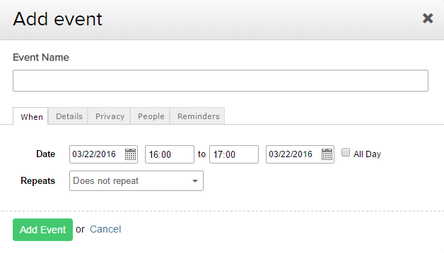 In the Add Event window, you'll need to enter an event name. You can also fill out details such as when, where, and attendees, as well as set