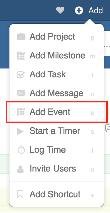 Select + Quick add from Teamwork.com's main navigation menu. In the quick add pop-out menu, click ... More, then select Event.