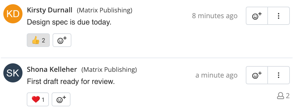 Within Teamwork.com, you can react to project items such as comments, messages, files and project updates.