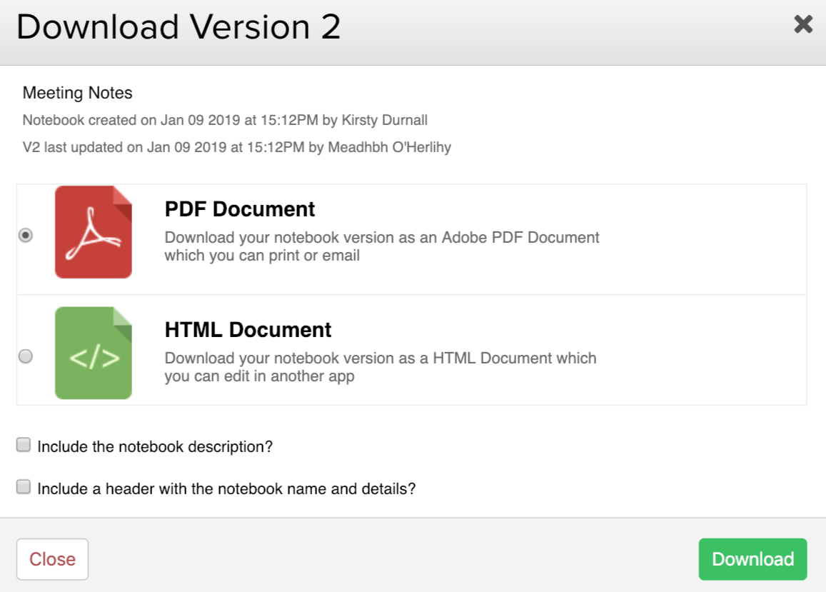 Within Teamwork.com, you can download a copy of a notebook in HTML or PDF format.