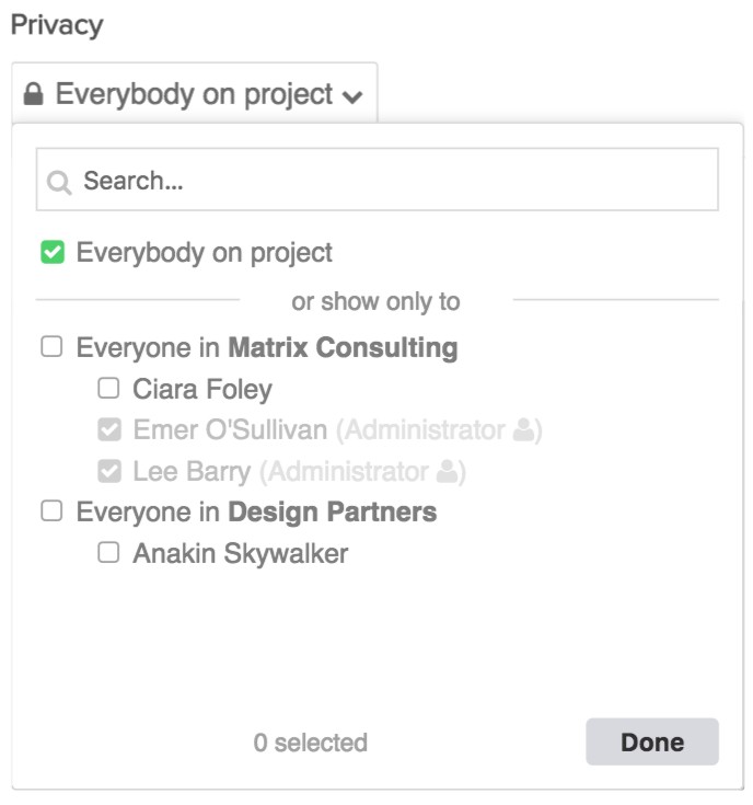 In the privacy modal, you can switch between people and teams. Privacy can be set to individual project members, entire companies, or teams.